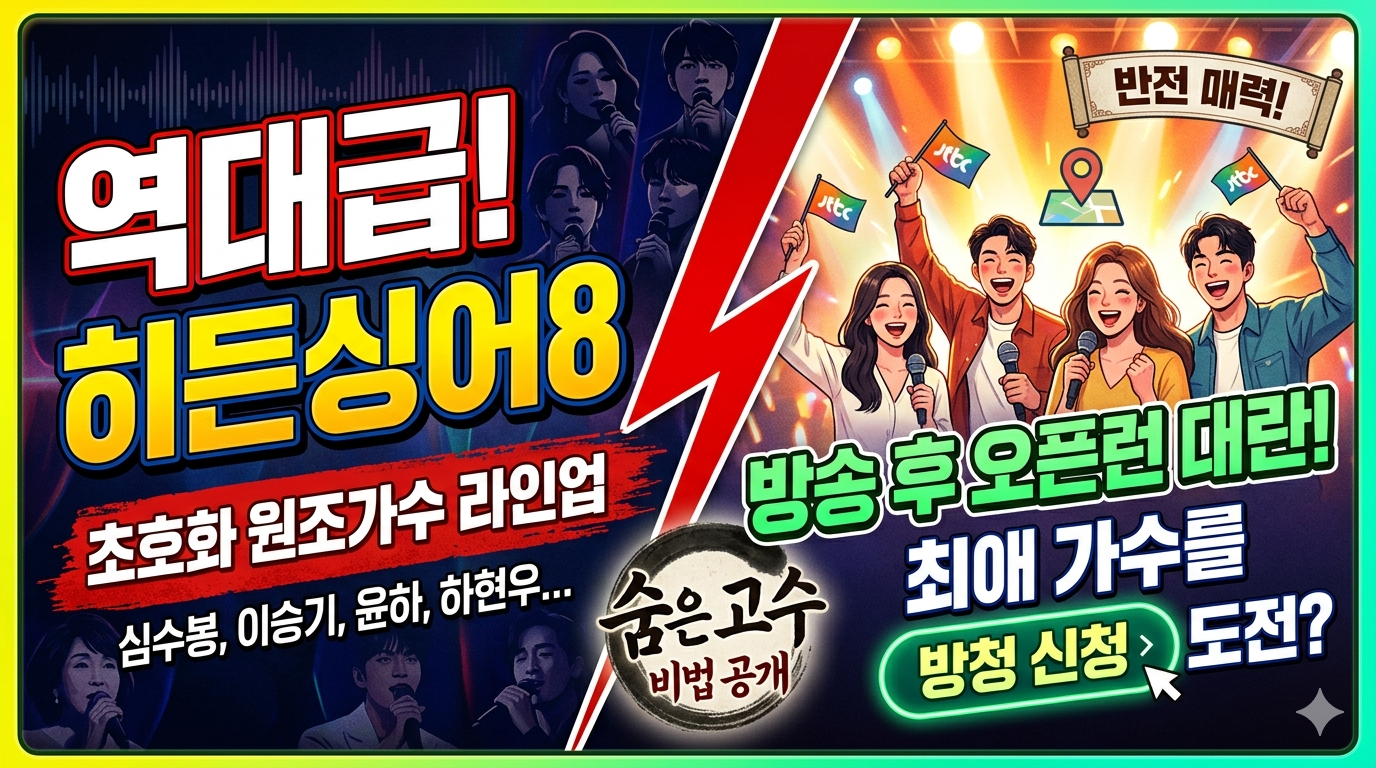 음악을 사랑하는 시청자들과 대한민국 가요계의 전설들을 한자리에서 만나보고 싶은 팬들에게 매주 주말 밤은 가슴 벅찬 시간입니다. 바로 원조 가수와 그 가수의 목소리부터 창법, 미세한 숨소리까지 완벽하게 소화해 내는 모창 능력자들이 펼치는 기적의 무대, JTBC의 대표 음악 예능 **'히든싱어8'**이 드디어 베일을 벗었기 때문인데요.